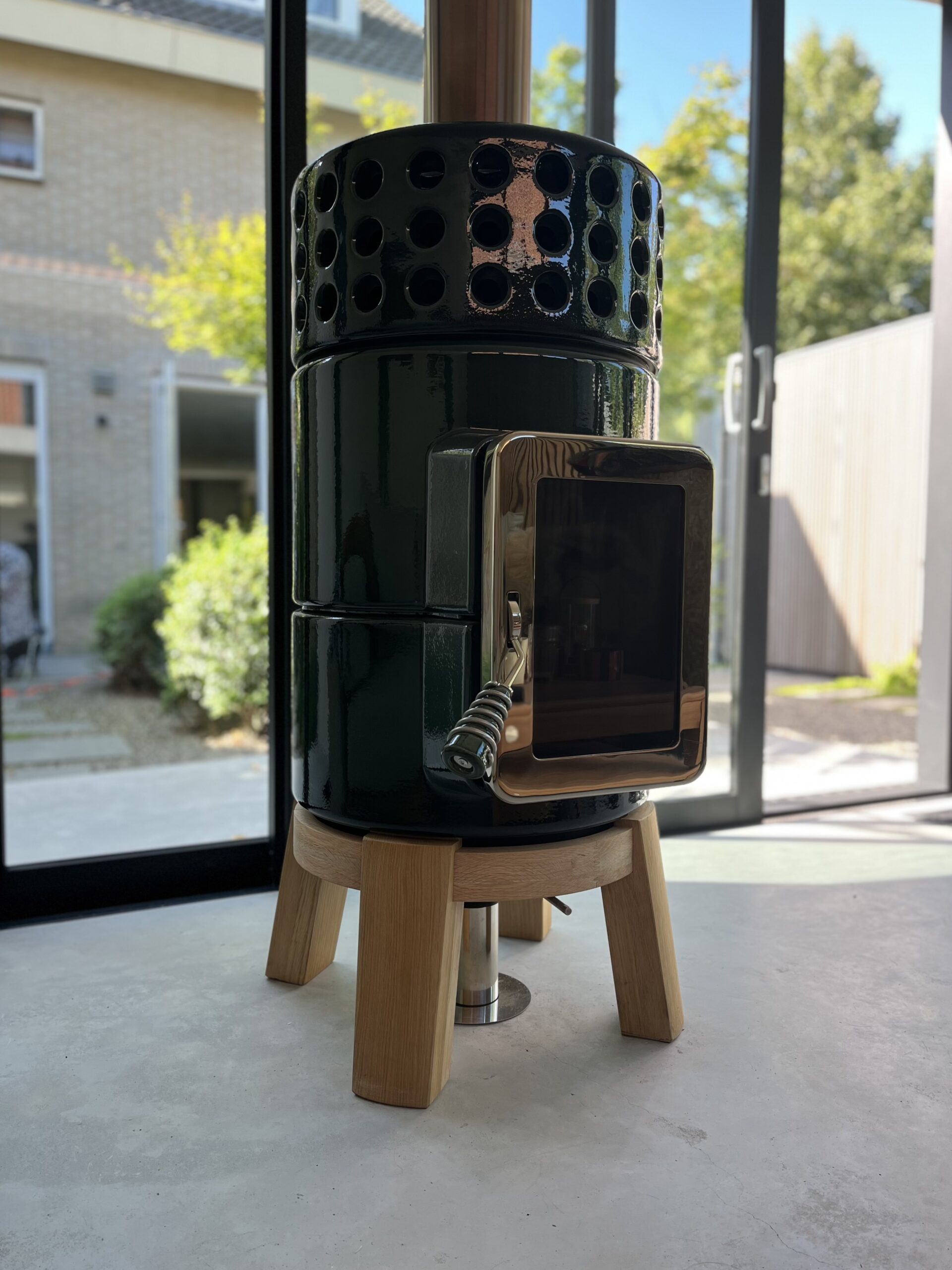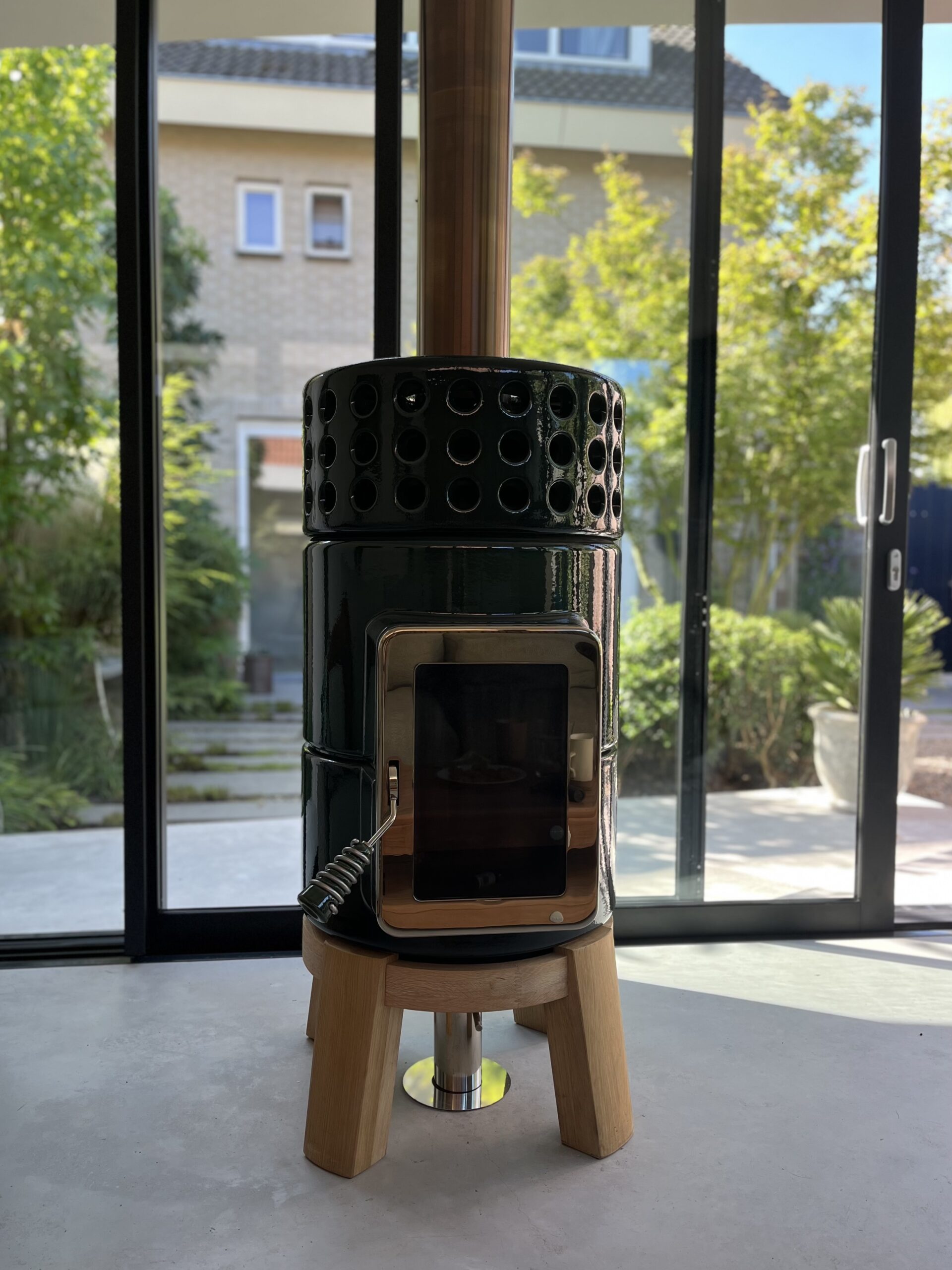Deze houtkachel, uitgevoerd in klassiek groen, hebben we geplaatst in een stijlvolle tuinloft